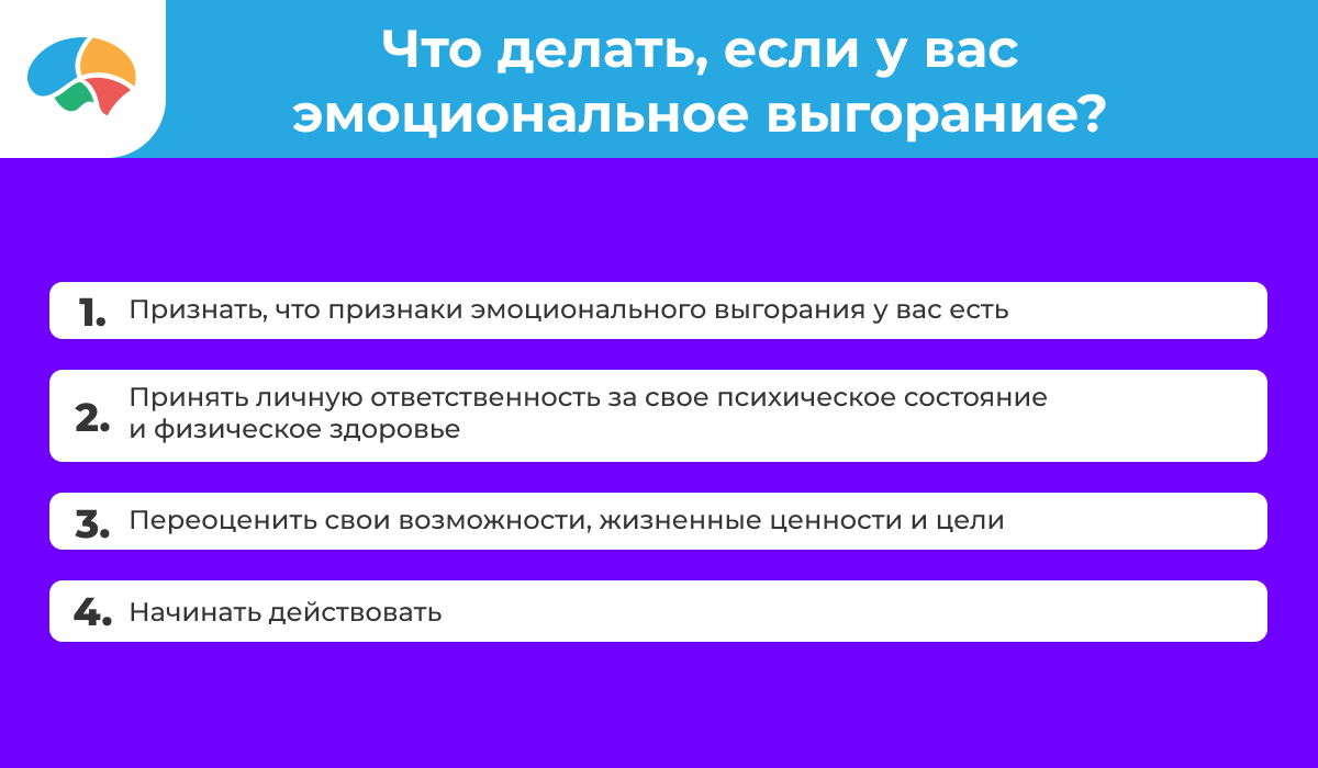 Больше проявлять заботу о себе и своем организме: добавить физические нагрузки, увеличить время и качество сна и т.д. Даже если это не решит основную причину эмоционального выгорания, это поможет испытывать меньше стресса и лучше справляться с нагрузкой.