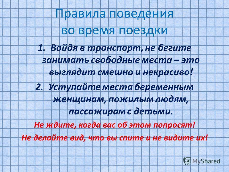 Правила поведения во время поездки 1. Войдя в транспорт, не бегите занимать свободные места – это выглядит смешно и некрасиво! 2. Уступайте места беременным женщинам, пожилым людям, пассажирам с детьми. Не ждите, когда вас об этом попросят! Не делайте вид, что вы спите и не видите их!
