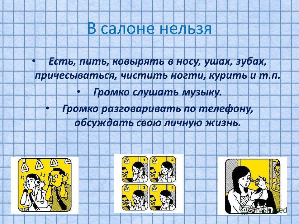В салоне нельзя Есть, пить, ковырять в носу, ушах, зубах, причесываться, чистить ногти, курить и т.п. Громко слушать музыку. Громко разговаривать по телефону, обсуждать свою личную жизнь.