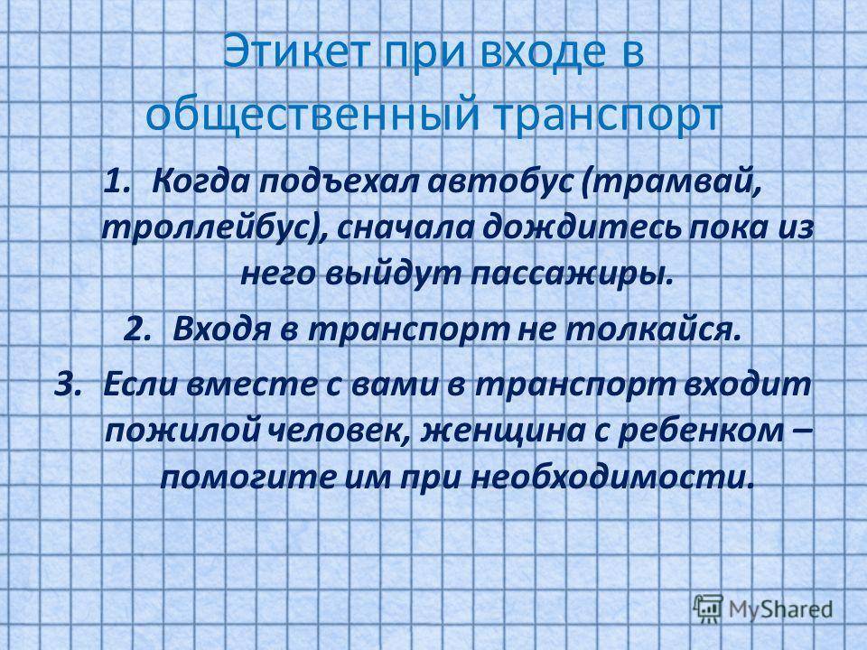 Этикет при входе в общественный транспорт 1. Когда подъехал автобус (трамвай, троллейбус), сначала дождитесь пока из него выйдут пассажиры. 2. Входя в транспорт не толкайся. 3. Если вместе с вами в транспорт входит пожилой человек, женщина с ребенком – помогите им при необходимости.