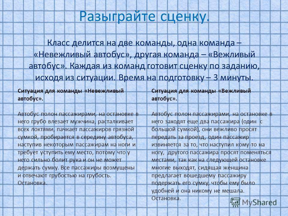 Разыграйте сценку. Класс делится на две команды, одна команда – «Невежливый автобус», другая команда – «Вежливый автобус». Каждая из команд готовит сценку по заданию, исходя из ситуации. Время на подготовку – 3 минуты. Ситуация для команды «Невежливый автобус». Автобус полон пассажирами, на остановке в него грубо влезает мужчина, расталкивает всех локтями, пачкает пассажиров грязной сумкой, пробирается в середину автобуса, наступив некоторым пассажирам на ноги и требует уступить ему место, потому что у него сильно болит рука и он не может держать сумку. Все пассажиры возмущены и отвечают грубостью на грубость. Остановка. Ситуация для команды «Вежливый автобус». Автобус полон пассажирами, на остановке в него заходят еще два пассажира (один с большой сумкой), они вежливо просят передать за проезд, один пассажир извиняется за то, что наступил кому-то на ногу, другого пассажира просят поменяться местами, так как на следующей остановке многие выходят, сидящая женщина предлагает вошедшему пассажиру подержать его сумку, чтобы ему было удобней и она никому не мешала. Остановка.