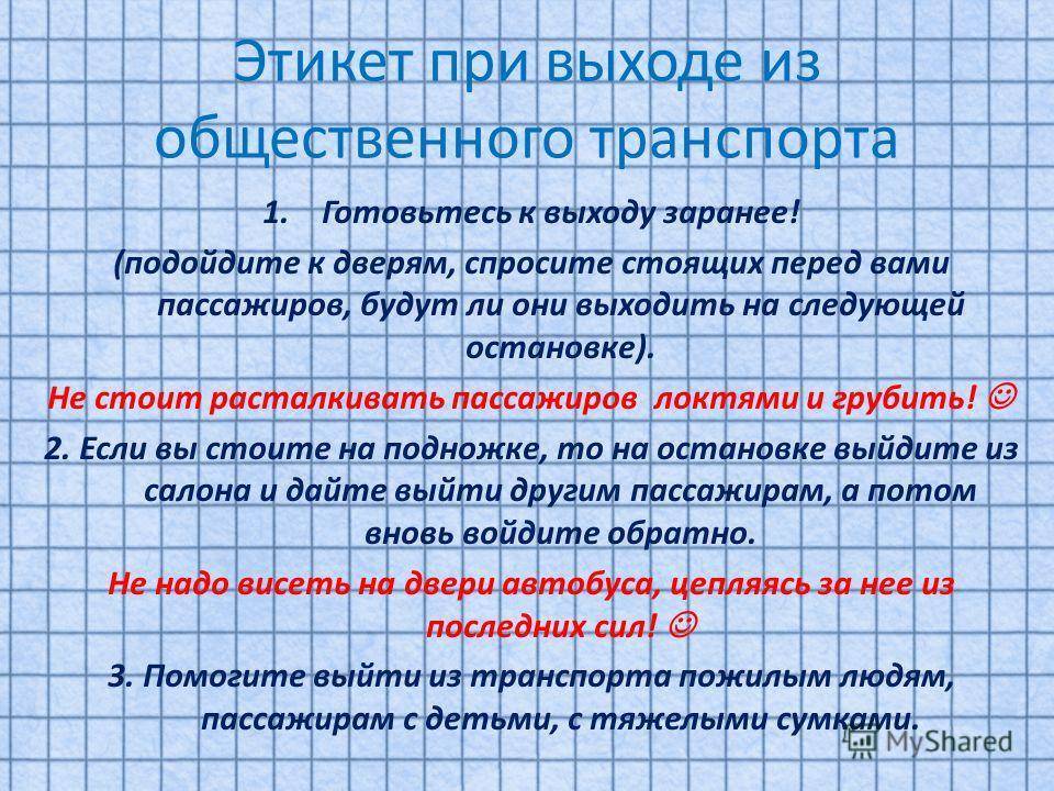 Этикет при выходе из общественного транспорта 1. Готовьтесь к выходу заранее! (подойдите к дверям, спросите стоящих перед вами пассажиров, будут ли они выходить на следующей остановке). Не стоит расталкивать пассажиров локтями и грубить! 2. Если вы стоите на подножке, то на остановке выйдите из салона и дайте выйти другим пассажирам, а потом вновь войдите обратно. Не надо висеть на двери автобуса, цепляясь за нее из последних сил! 3. Помогите выйти из транспорта пожилым людям, пассажирам с детьми, с тяжелыми сумками.