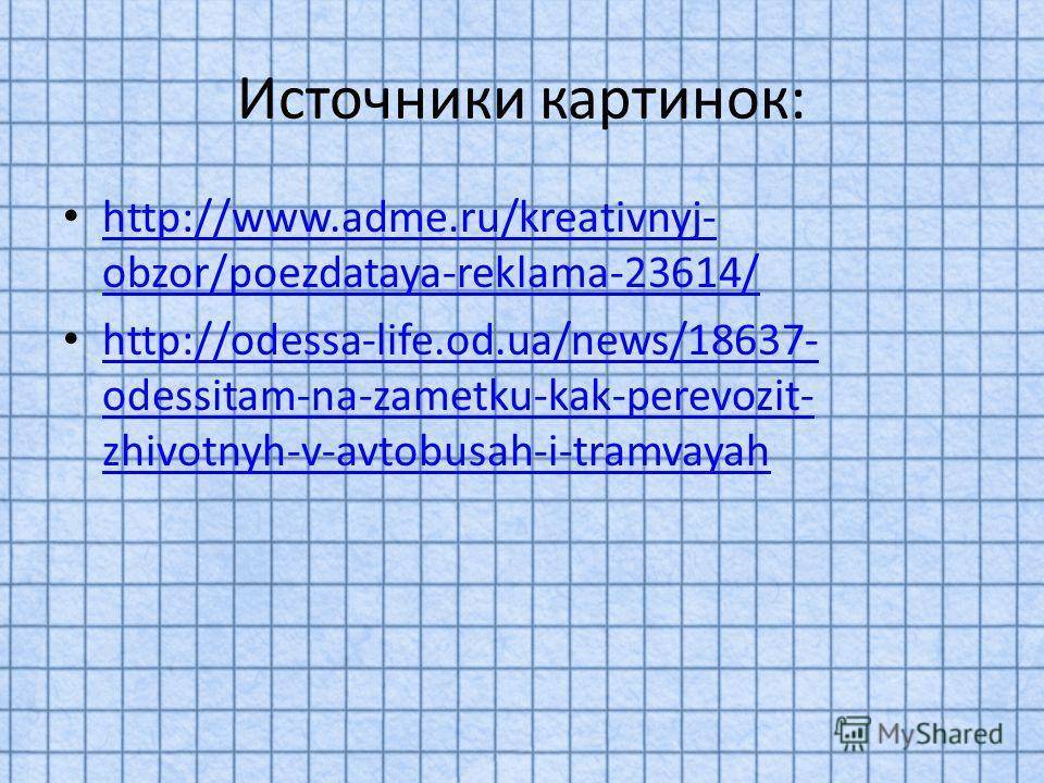 Источники картинок: obzor/poezdataya-reklama-23614/ obzor/poezdataya-reklama-23614/ odessitam-na-zametku-kak-perevozit- zhivotnyh-v-avtobusah-i-tramvayah odessitam-na-zametku-kak-perevozit- zhivotnyh-v-avtobusah-i-tramvayah