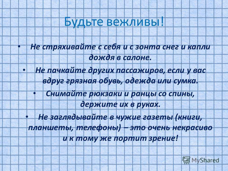Будьте вежливы! Не стряхивайте с себя и с зонта снег и капли дождя в салоне. Не пачкайте других пассажиров, если у вас вдруг грязная обувь, одежда или сумка. Снимайте рюкзаки и ранцы со спины, держите их в руках. Не заглядывайте в чужие газеты (книги, планшеты, телефоны) – это очень некрасиво и к тому же портит зрение!