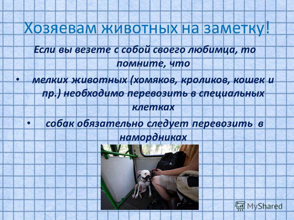 Хозяевам животных на заметку! Если вы везете с собой своего любимца, то помните, что мелких животных (хомяков, кроликов, кошек и пр.) необходимо перевозить в специальных клетках собак обязательно следует перевозить в намордниках
