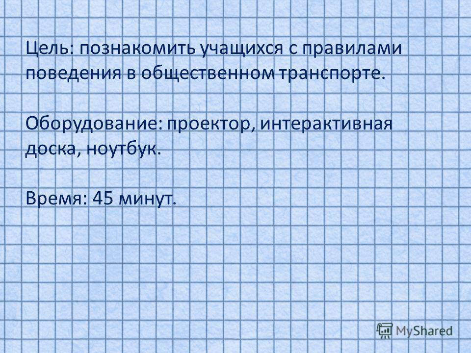 Цель: познакомить учащихся с правилами поведения в общественном транспорте. Оборудование: проектор, интерактивная доска, ноутбук. Время: 45 минут.