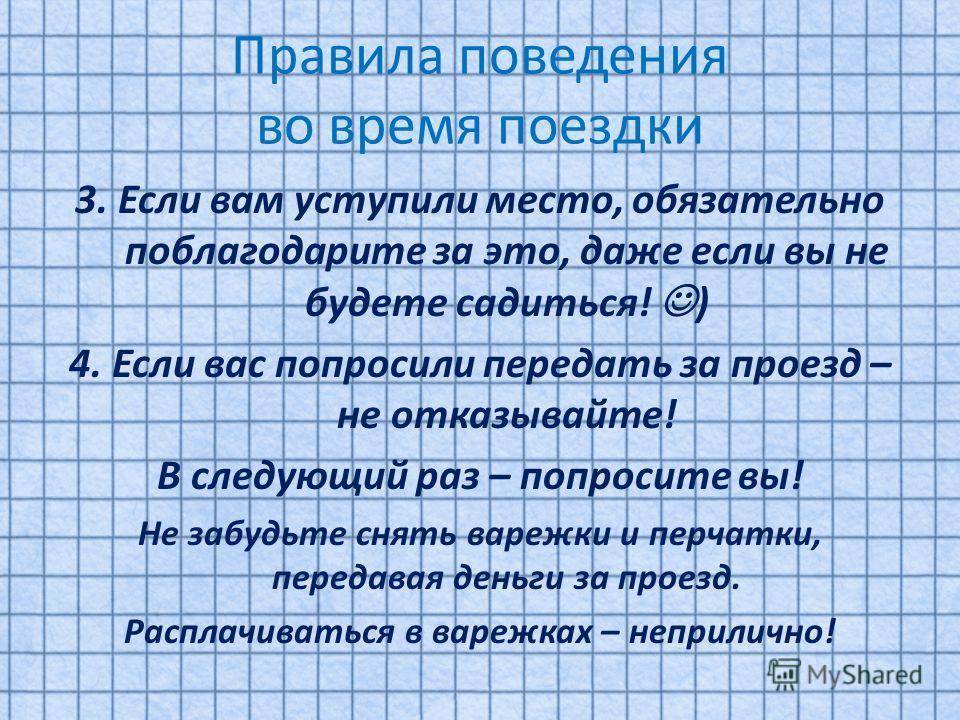 Правила поведения во время поездки 3. Если вам уступили место, обязательно поблагодарите за это, даже если вы не будете садиться! ) 4. Если вас попросили передать за проезд – не отказывайте! В следующий раз – попросите вы! Не забудьте снять варежки и перчатки, передавая деньги за проезд. Расплачиваться в варежках – неприлично!