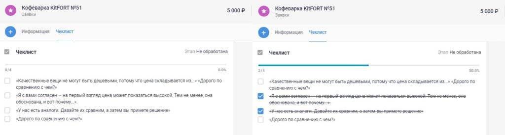 В некоторых системах, например, в S2 CRM, при открытии карточки сделки открываются чек-листы. В них можно написать скрипт пошаговой отработки возражения “Дорого”, что очень упростит работу.