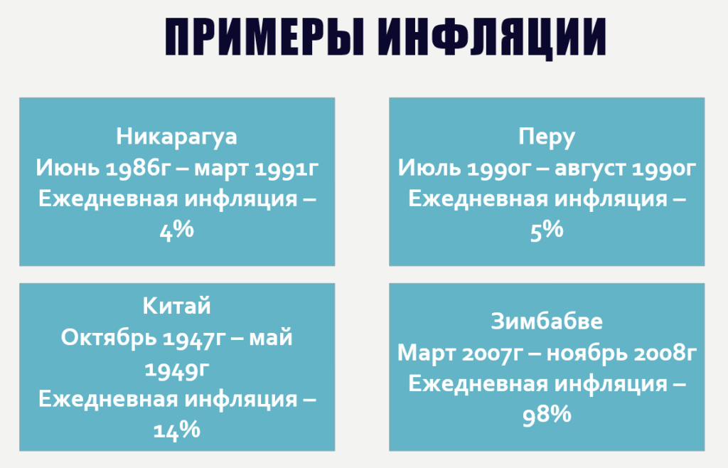 - Инфляция, которую мы наблюдали сравнительно недавно. Зимбабве испытывала ежедневную инфляцию в 98% с марта 2007 по ноябрь 2008. Причиной тому послужили: конфискация частного имущества и война.