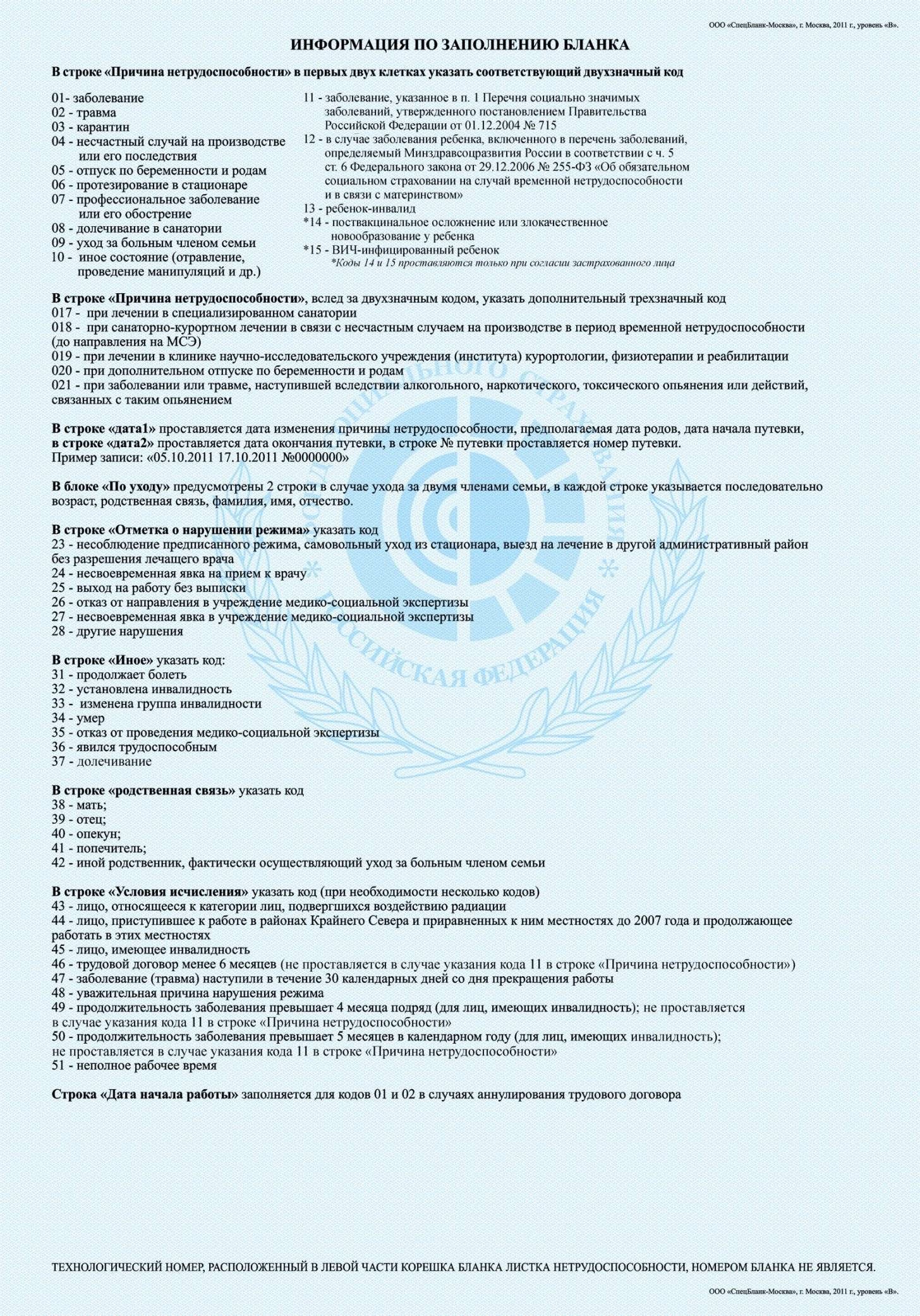 Именно поэтому желательно самому проконтролировать заполненный документ и в случае необходимости указать на ошибки в его заполнении. Бланк нетрудоспособности с верно указанными шифрами причин заболевания — это гарантия соблюдения трудового законодательства и прав работающего.
