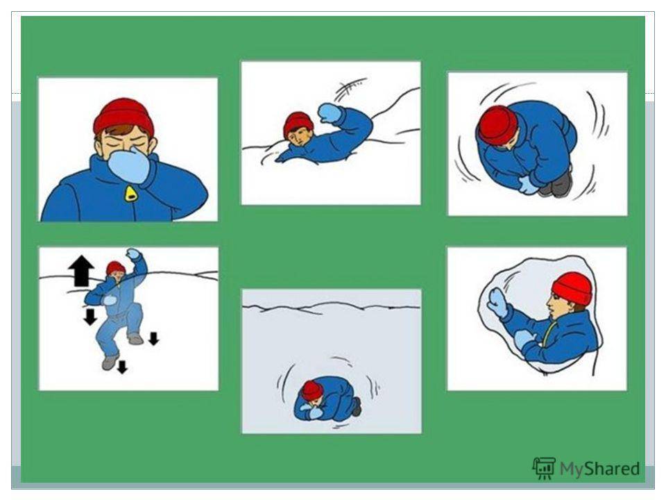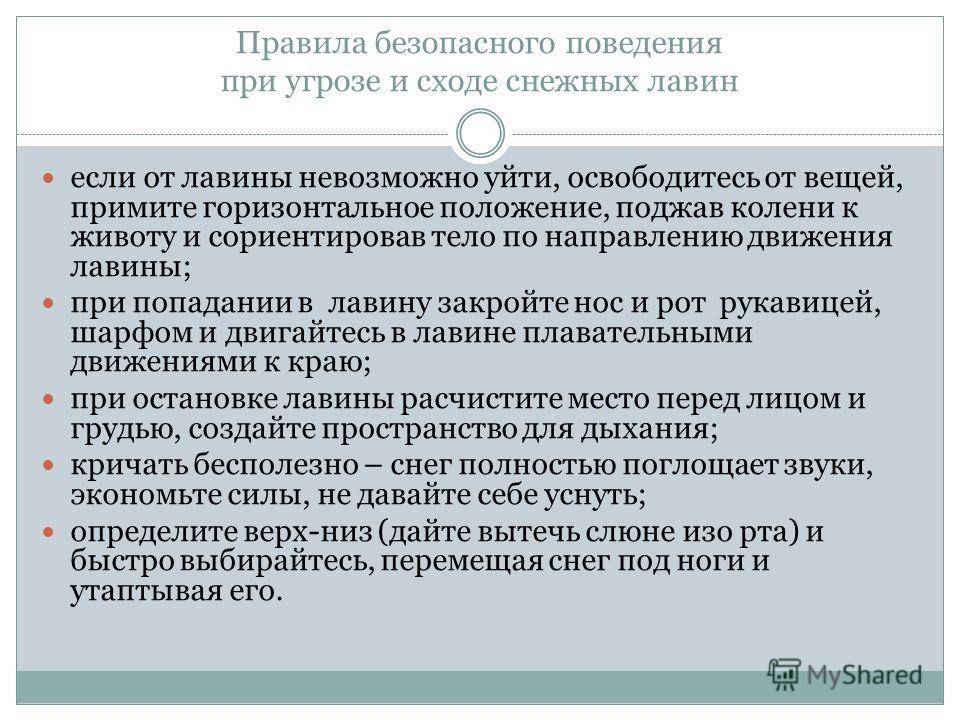 Правила безопасного поведения при угрозе и сходе снежных лавин если от лавины невозможно уйти, освободитесь от вещей, примите горизонтальное положение, поджав колени к животу и сориентировав тело по направлению движения лавины; при попадании в лавину закройте нос и рот рукавицей, шарфом и двигайтесь в лавине плавательными движениями к краю; при остановке лавины расчистите место перед лицом и грудью, создайте пространство для дыхания; кричать бесполезно – снег полностью поглощает звуки, экономьте силы, не давайте себе уснуть; определите верх-низ (дайте вытечь слюне изо рта) и быстро выбирайтесь, перемещая снег под ноги и утаптывая его.