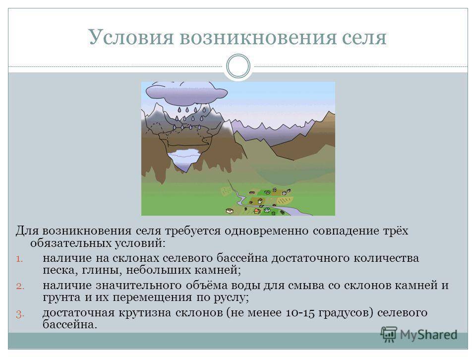 Условия возникновения селя Для возникновения селя требуется одновременно совпадение трёх обязательных условий: 1. наличие на склонах селевого бассейна достаточного количества песка, глины, небольших камней; 2. наличие значительного объёма воды для смыва со склонов камней и грунта и их перемещения по руслу; 3. достаточная крутизна склонов (не менее градусов) селевого бассейна.