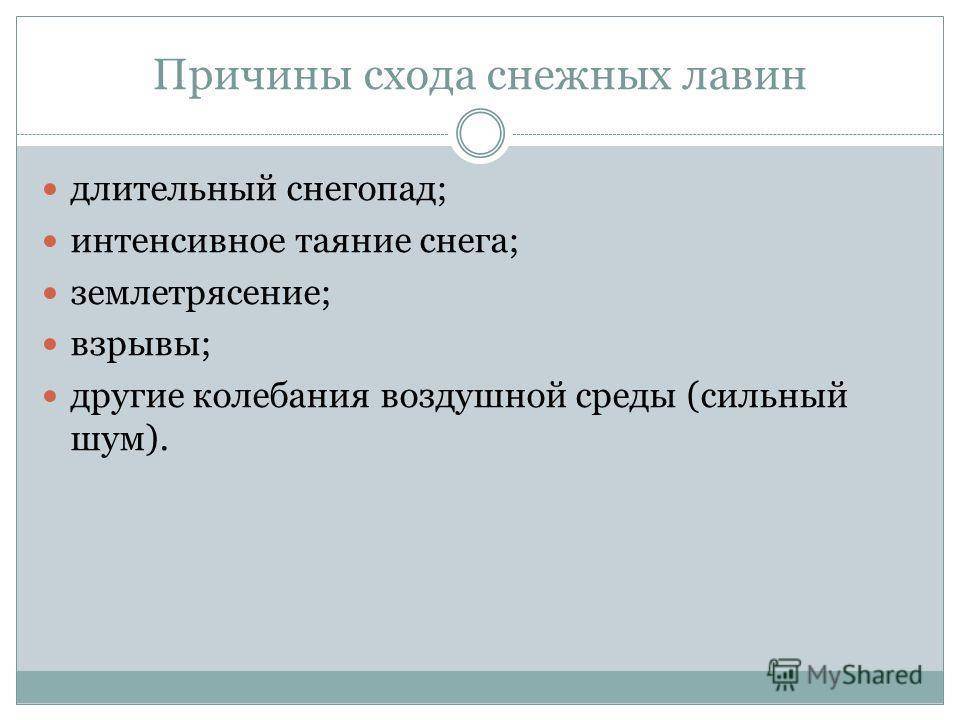 Причины схода снежных лавин длительный снегопад; интенсивное таяние снега; землетрясение; взрывы; другие колебания воздушной среды (сильный шум).