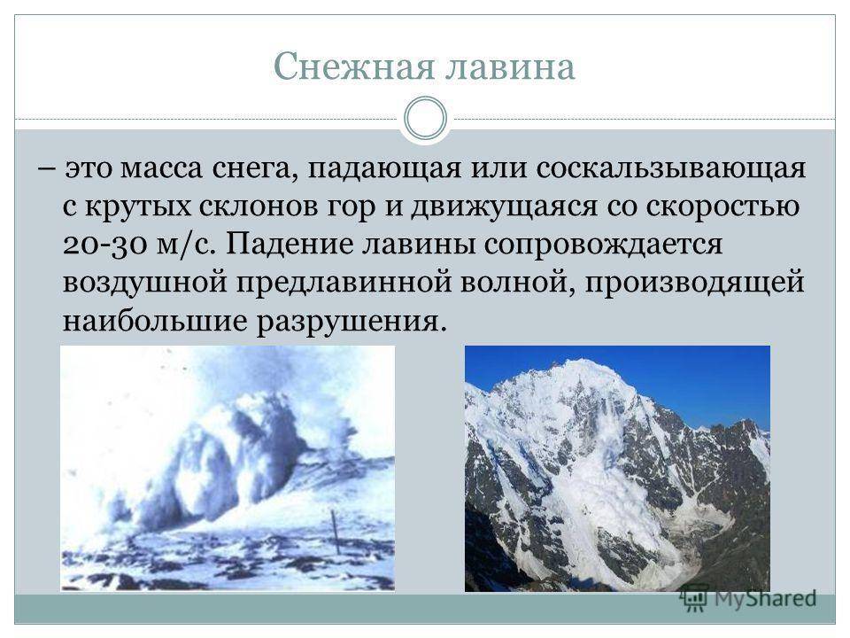 Снежная лавина – это масса снега, падающая или соскальзывающая с крутых склонов гор и движущаяся со скоростью м/с. Падение лавины сопровождается воздушной предлавинной волной, производящей наибольшие разрушения.