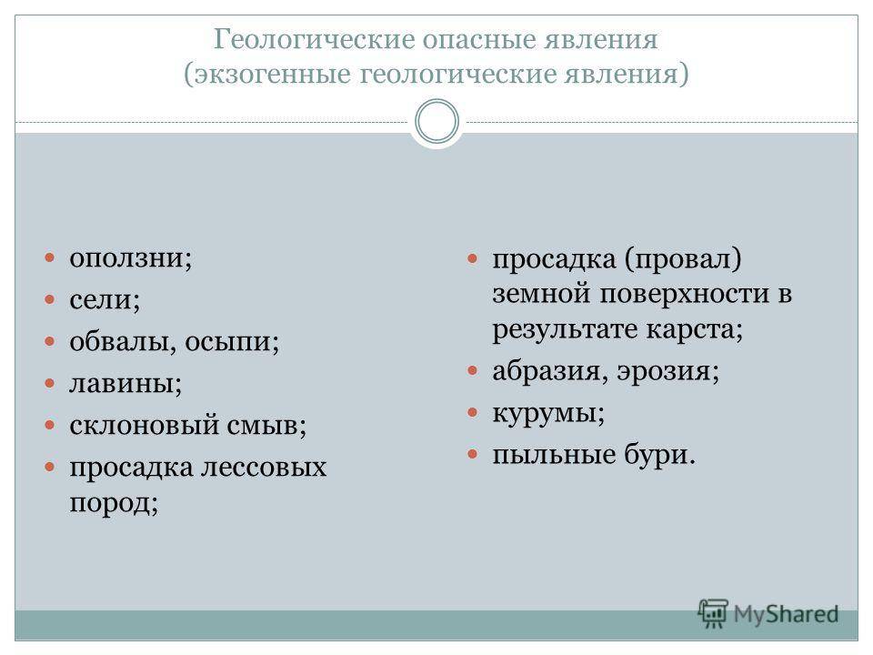 Геологические опасные явления (экзогенные геологические явления) оползни; сели; обвалы, осыпи; лавины; склоновый смыв; просадка лессовых пород; просадка (провал) земной поверхности в результате карста; абразия, эрозия; курумы; пыльные бури.