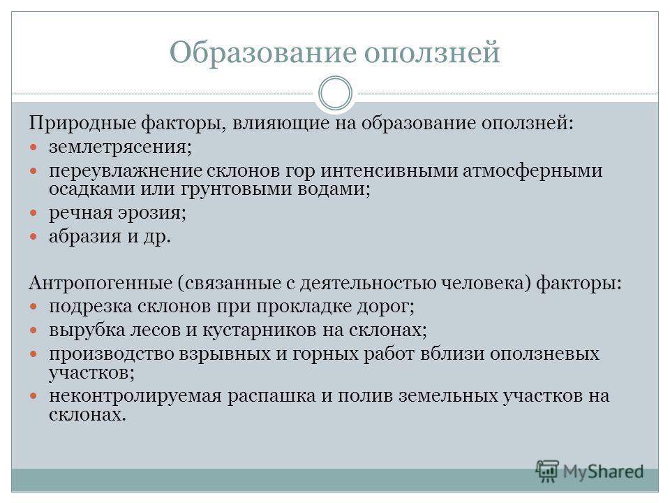 Образование оползней Природные факторы, влияющие на образование оползней: землетрясения; переувлажнение склонов гор интенсивными атмосферными осадками или грунтовыми водами; речная эрозия; абразия и др. Антропогенные (связанные с деятельностью человека) факторы: подрезка склонов при прокладке дорог; вырубка лесов и кустарников на склонах; производство взрывных и горных работ вблизи оползневых участков; неконтролируемая распашка и полив земельных участков на склонах.