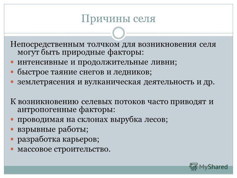 Причины селя Непосредственным толчком для возникновения селя могут быть природные факторы: интенсивные и продолжительные ливни; быстрое таяние снегов и ледников; землетрясения и вулканическая деятельность и др. К возникновению селевых потоков часто приводят и антропогенные факторы: проводимая на склонах вырубка лесов; взрывные работы; разработка карьеров; массовое строительство.