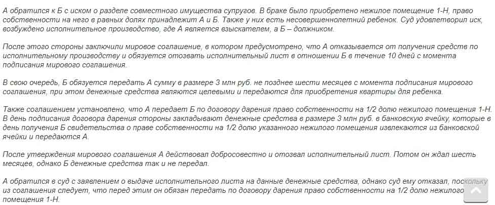 Например, супруги делят собственность, нажитую в браке, путём длительных переговоров их адвокатам удалось решить проблему. В договоре фиксируется, что квартира, машина и ½ земельного участка переходит к жене, которая является истцом, а мужу остаётся дача и вторая часть земельного участка, при этом жена выплачивает бывшему супругу частичную компенсацию стоимости причитающегося ей имущества.
