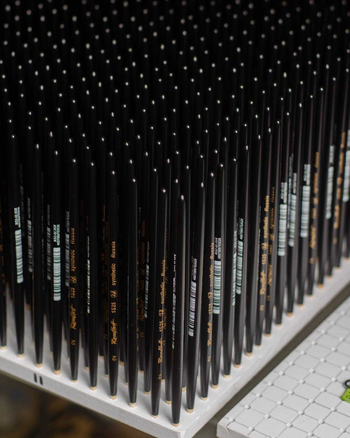 Специалист технического участка устанавливает образец в специальное оборудование и фиксирует изменения через контрольные отрезки времени. Затем кисти, визуально успешно прошедшие испытания, снова отправляются на тестирование к профессиональному художнику.