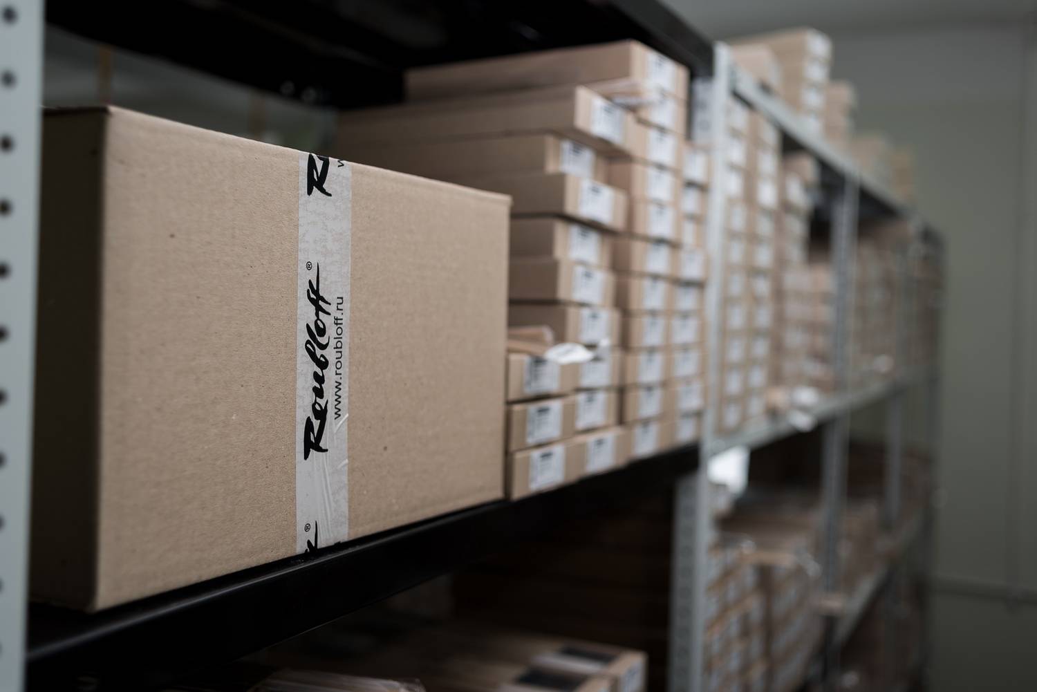 - Специальные коробки с упорами под каждый размер, что позволяет складировать их на полку в пять и более слоёв, этикетка на торце коробки — для удобства поиска.