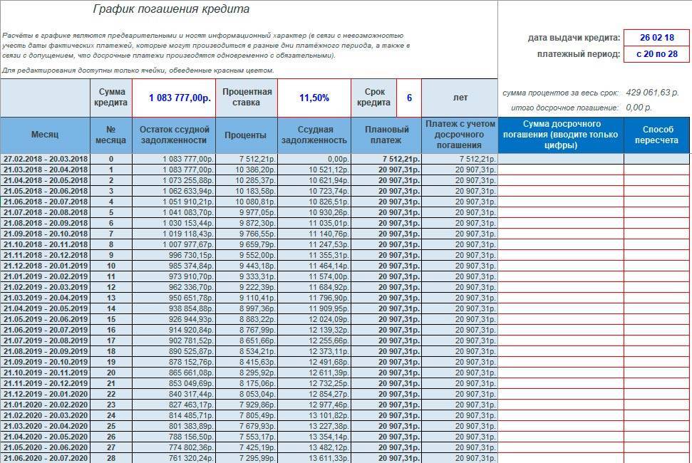 На сайте Сбербанка есть ипотечный калькулятор, но он не расписывает все детали так досконально, поэтому мы внесли новые данные в калькулятор ВТБ24, который представляет из себя файл Exel, скачанный с сайта банка, где называется «калькулятор досрочного погашения» и получили следующие цифры: