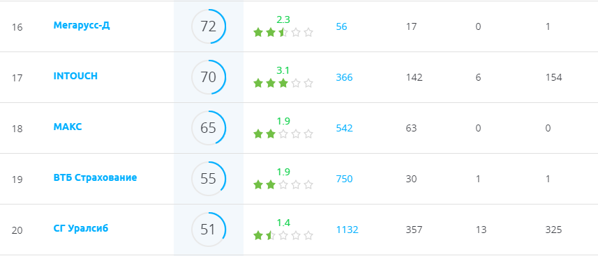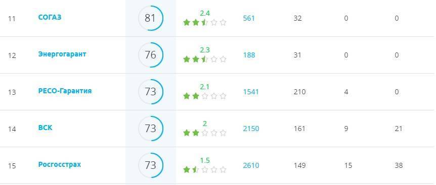 Позиция же страховых компаний в рейтинге не всегда соответствует известности бренда и уровню развития региональной сети. Например, компания «РСХБ-Страхование», имеющая поддержку одноимённого банка и доступ к страхованию его залогового транспорта, со сборами почти в 290 миллионов рублей находится лишь на 32 строчке.