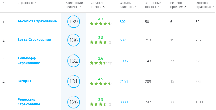 Рейтинг надежности страховых компаний КАСКО 2021 в Москве