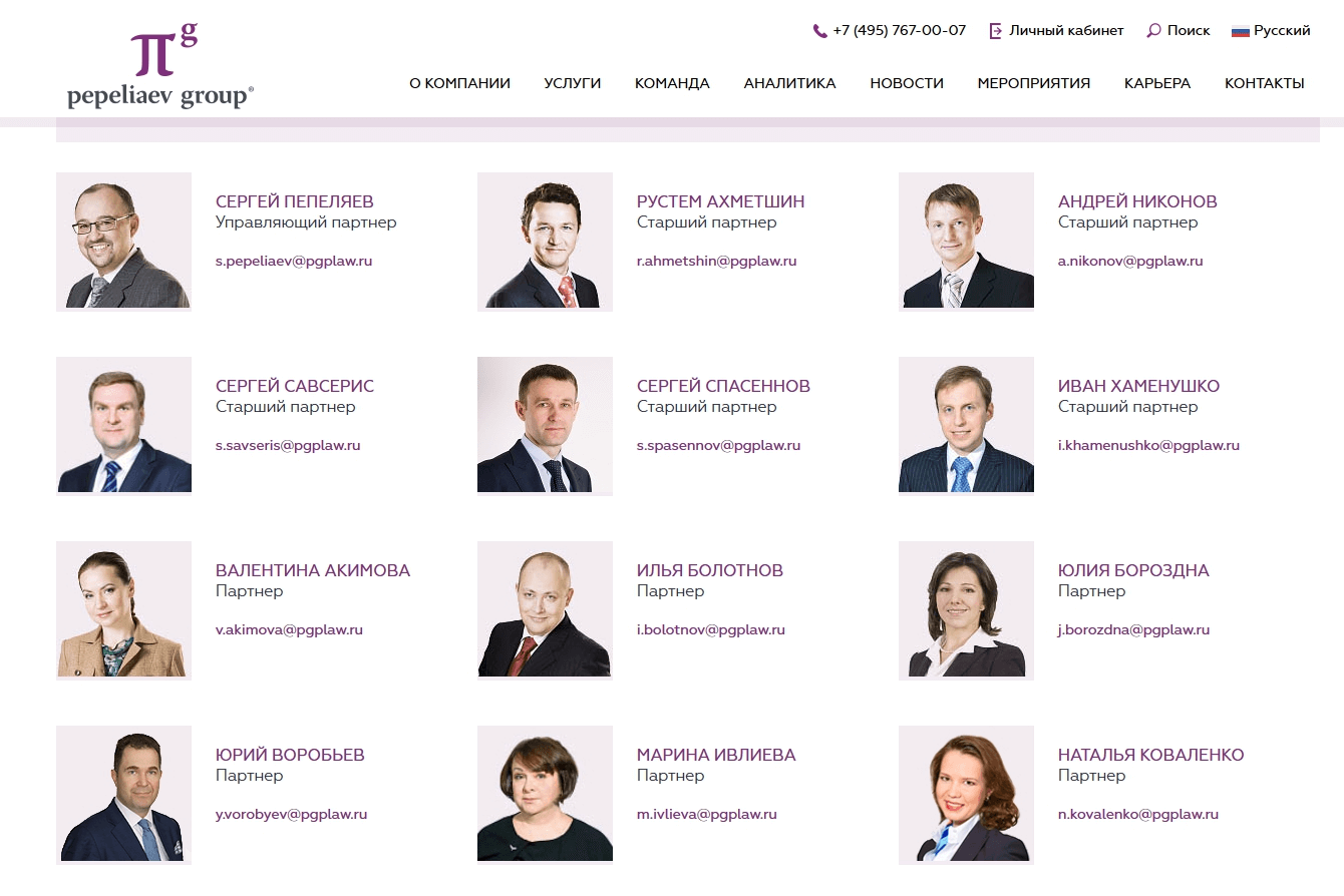 Одна из старейших юридических фирм России. На сайте – основные виды деятельности, услуги компании, новости, фото команды. В разделе “Признание” – социальные доказательства: членство в ассоциациях, позиции в рейтингах, все, что способно убедить посетителя сайта, что здесь работают надежные юристы. В разделе “Публикации” – случаи из судебной практики и полезные советы. Есть даже блог, в котором регулярно публикуются статьи.