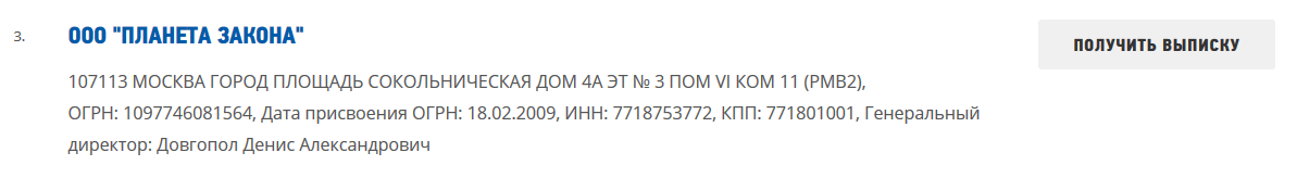 Идем дальше. Допустим, такая юридическая компания существует, но вдруг она создана буквально вчера, а вы хотите иметь дело с профессионалами на рынке? Поможет тот же сервис https://egrul.nalog.ru – в выписке будет указана дата регистрации компании и присвоение ей ОГРН – основного государственного регистрационного номера.