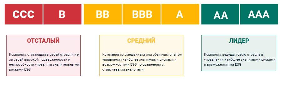 MSCI делит компании на три категории: лидеры с рейтингом AA и AAA; компании со средними показателями — A, BBB, BB; и отстающие — B, CCC