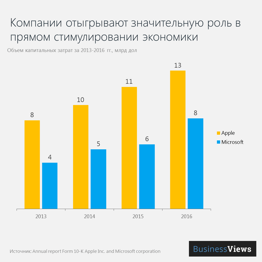 Гиганты открывают новые производства, покупают недвижимость и оборудование — все эти капитальные затраты напрямую стимулируют развитие экономики. В 2016 году суммарные затраты такого рода превысили 20 миллиардов долларов (Apple — более 12 миллиардов, Microsoft — более восьми).