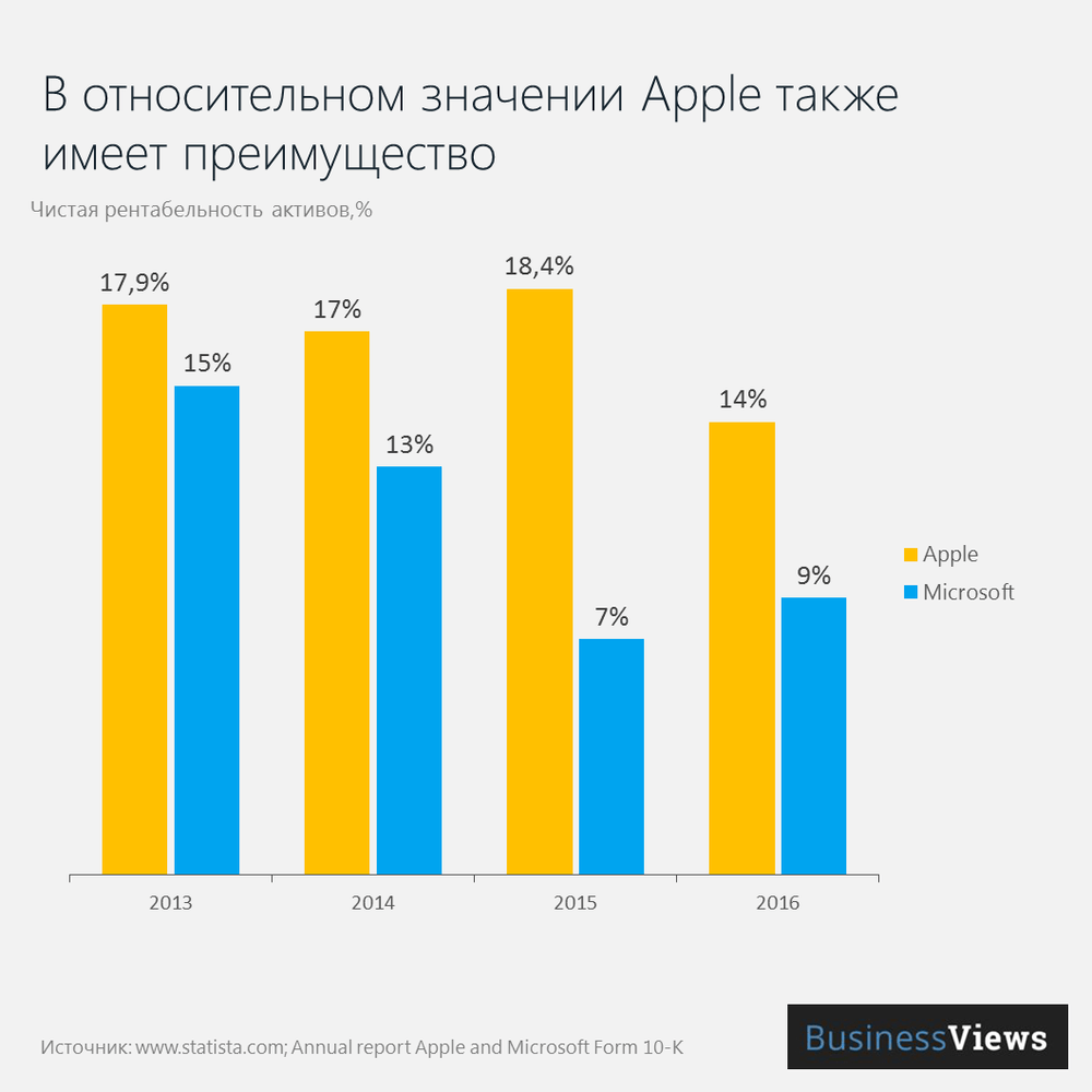 Показатель чистой прибыли в сравнении с собственным капиталом тоже у “Эппл” получше будет. Это значит, что в Apple эффективнее распоряжаются той частью капитала, которая принадлежит ее собственникам.