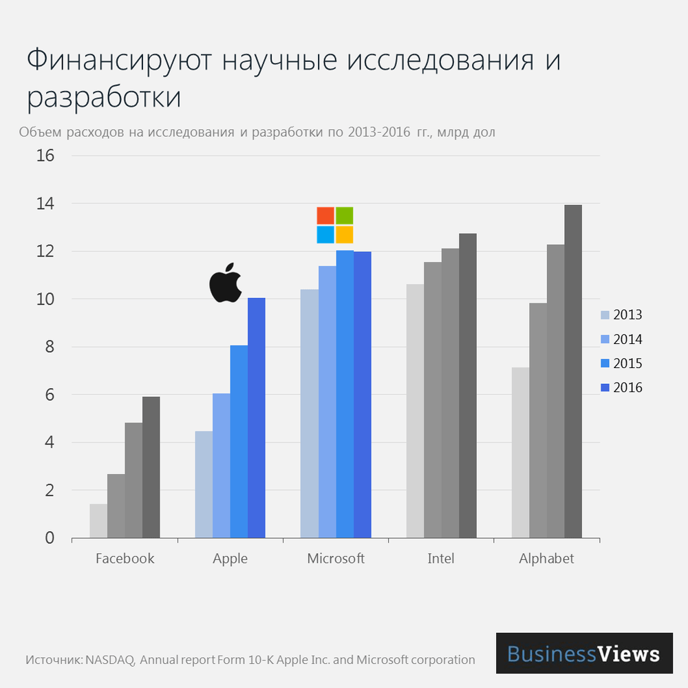 Чтобы оставаться на плаву и быть конкурентоспособными, обе компании вынуждены много тратить на научные исследования. В итоге новые разработки захватывают мир и повышают общий уровень жизни. В 2016 году Apple вложила в прогресс 10 миллиардов, Microsoft — 11.