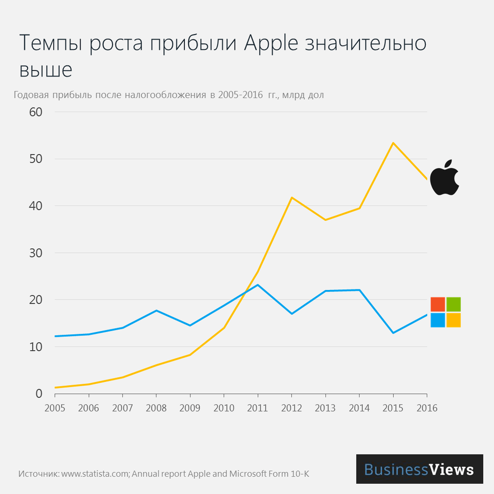 В 2005 году годовая прибыль “Эппл” составила всего 1,3 миллиарда, а в 2016 — уже 45 миллиардов. Пик прибыли при этом пришелся на 2015 год — 53 миллиарда. Годовая прибыль “Майкрософт” по сравнению с 2005 годом выросла на 4,5 миллиарда, а максимума она достигла в 2011 году.