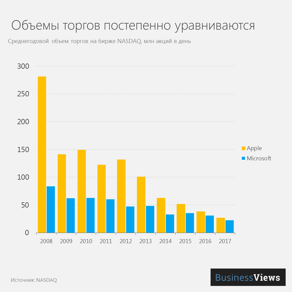 И инвесторы верят в дальнейшее подорожание акций Apple, закупаясь ими в расчете на долгосрочный рост. При этом объемы торгов акций обеих компаний постепенно уменьшаются, акции все реже меняют владельцев — признак зрелости, устойчивости и надежности компаний. В 2008 году на бирже NASDAQ продавалось почти 300 миллионов акций Apple и почти 100 миллионов акций Microsoft, а сейчас это 26 и 22 миллиона соответственно. Объемы упали и почти сравнялись.