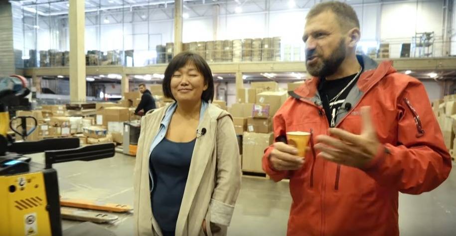 Татьяна Бакальчук беседует с Игорем Рыбаковым на складе своей компании