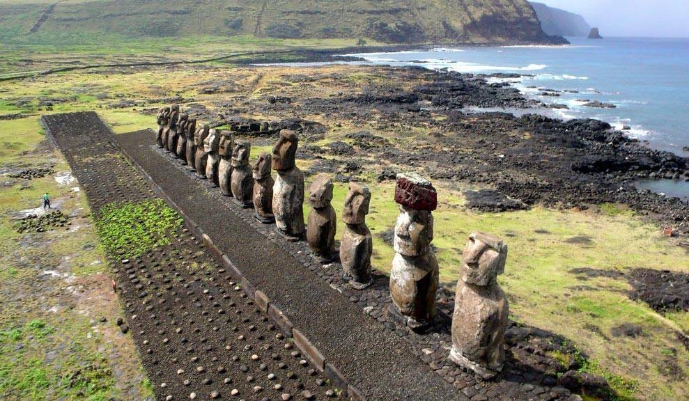 Моаи сооружены из прочных пород вулкана Рано Раку, в котловане которого были обнаружены элементы удивительных идолов. Он является одним самых красивых на острове. В его кратере собирается дождевая вода, а отблески солнечных лучей играют с каменными стенами и зеркальной поверхностью бирюзовой водной глади.
