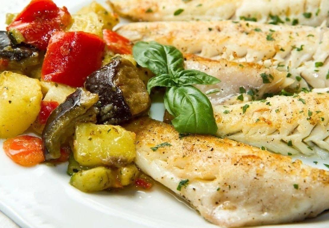 Палтус, запеченный в печи с пармезаном, домашним картофелем и помидорами