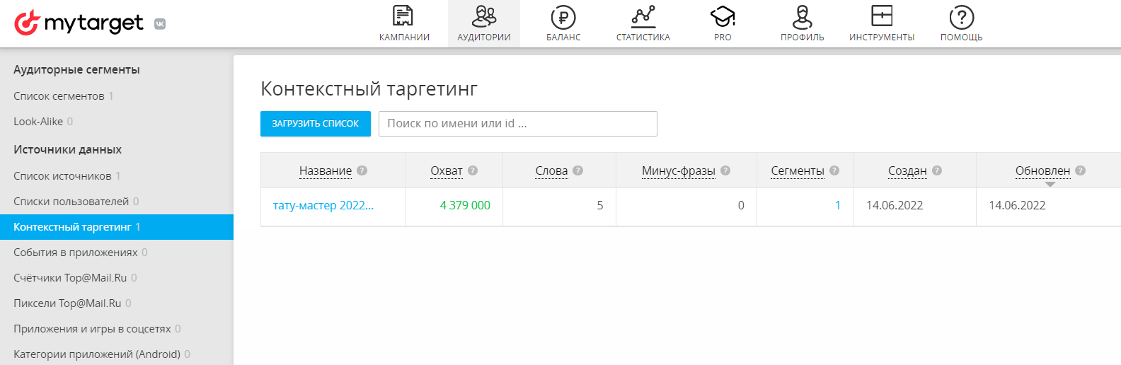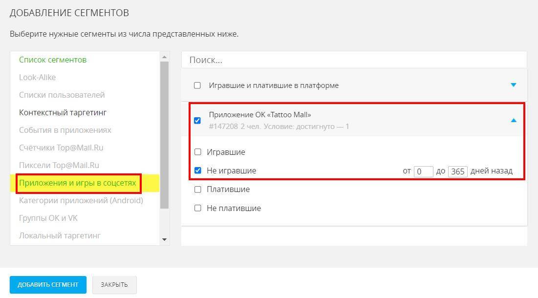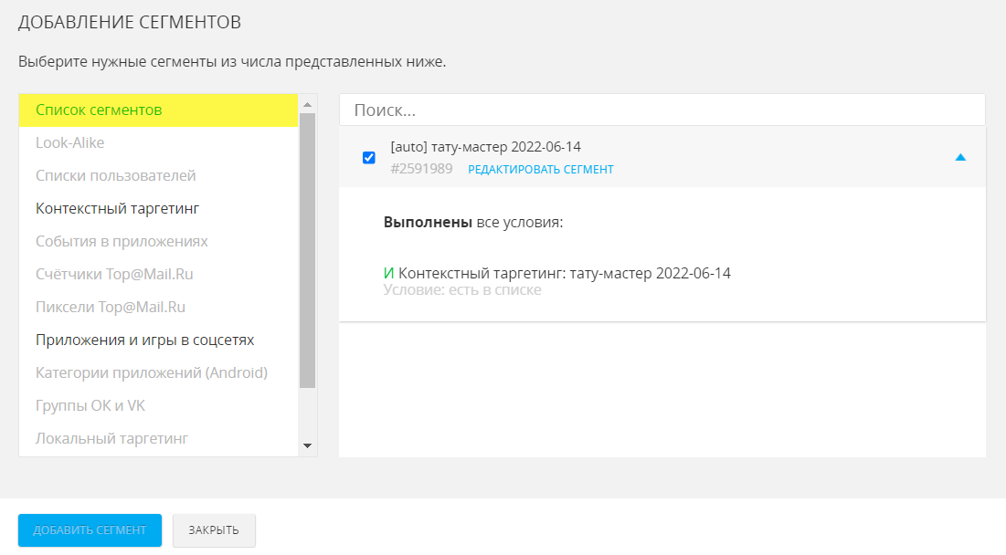 Отмечаем галочкой наш сегмент контекстного таргетинга.