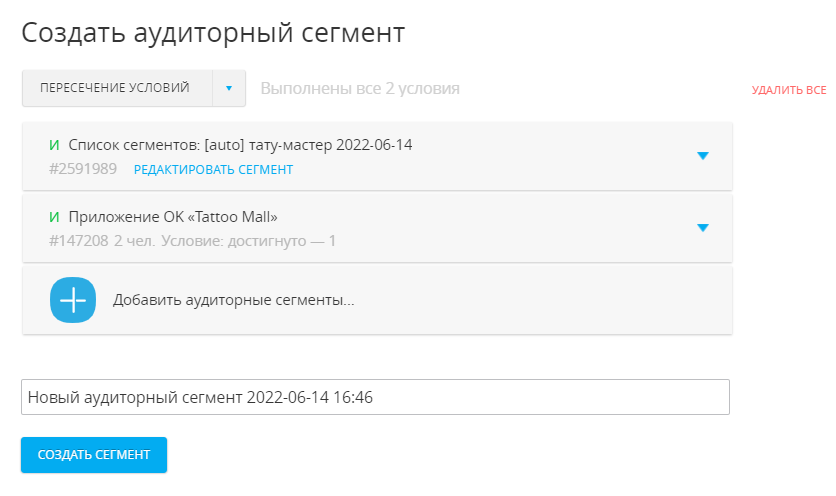 Теперь добавляем второе условие. Нажимаем «Добавить аудиторные сегменты».
