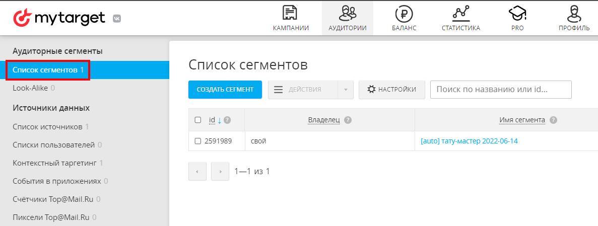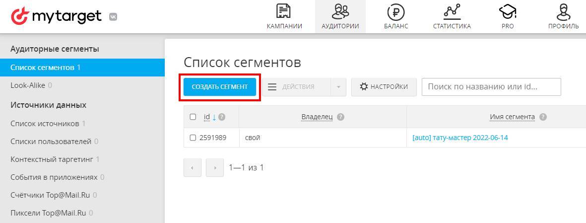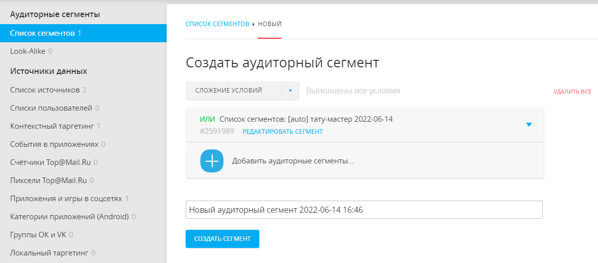 Вводим название и нажимаем «Создать сегмент» — он появляется в общем списке.
