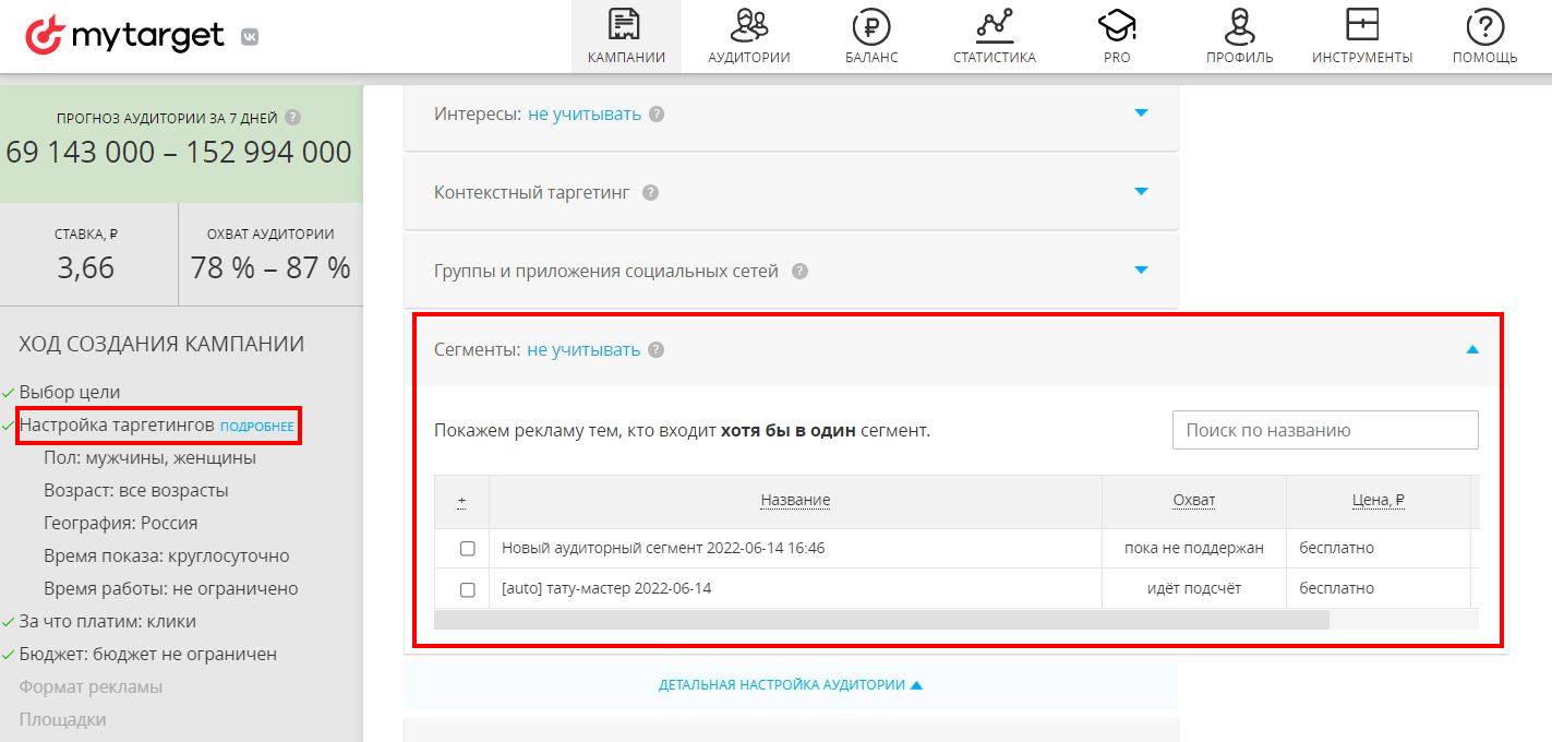 Для этого на этапе «Настройка таргетингов» разверните пункт «Сегменты».