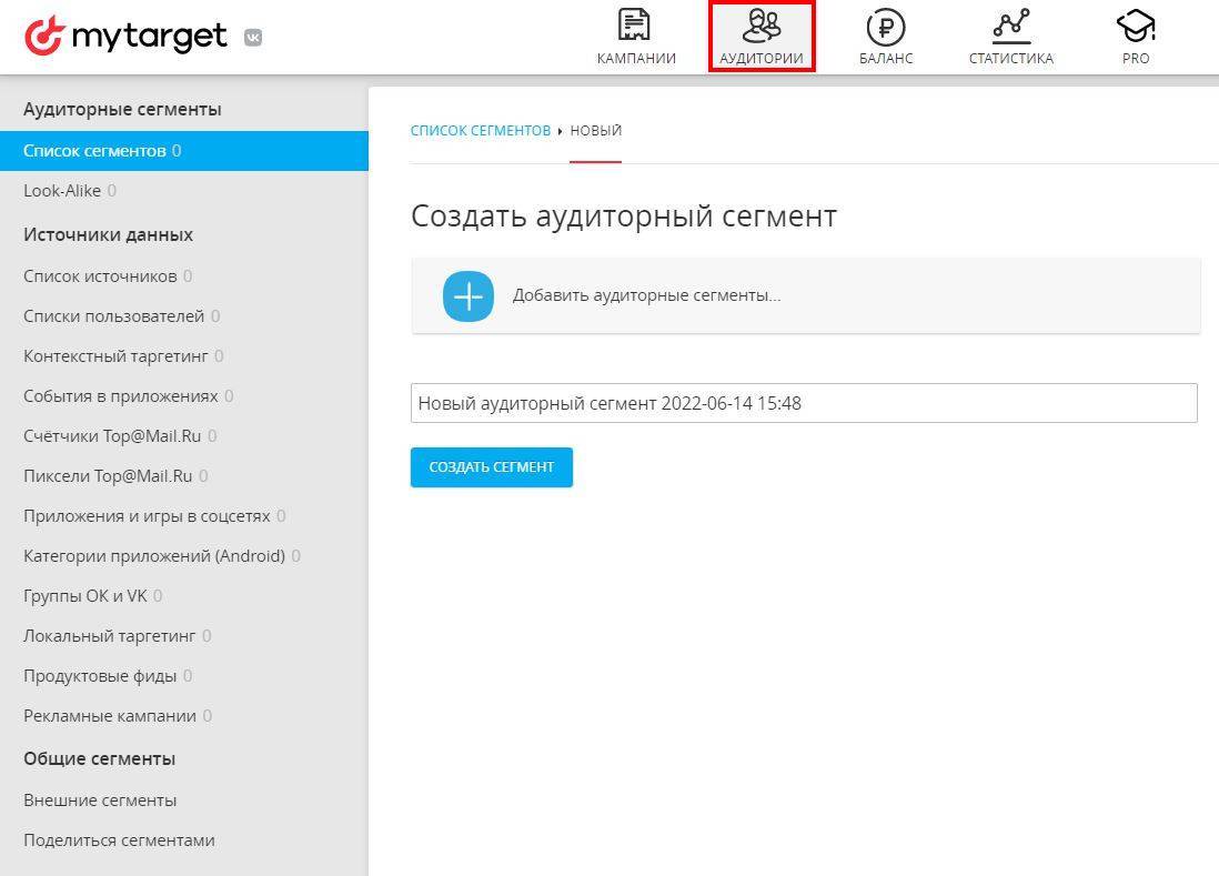 В разделе «Список сегментов» нажмите «Создать сегмент».