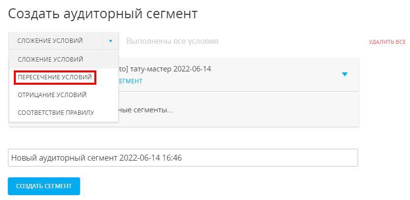 Нажимаем на «Сложение условий», выбираем «Пересечение условий».