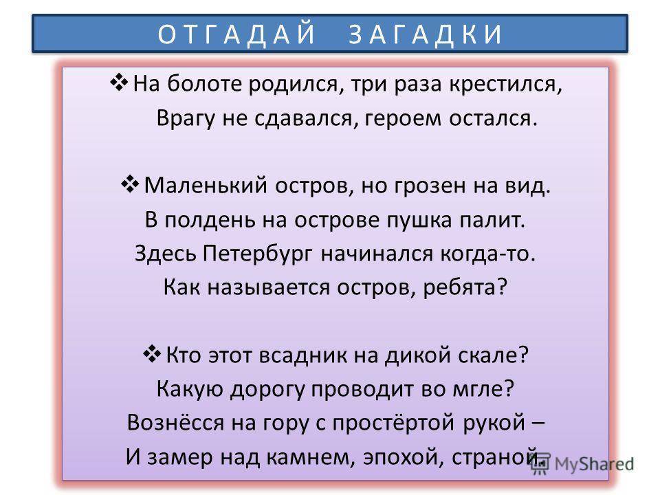 О Т Г А Д А Й З А Г А Д К И На болоте родился, три раза крестился, Врагу не сдавался, героем остался. Маленький остров, но грозен на вид. В полдень на острове пушка палит. Здесь Петербург начинался когда-то. Как называется остров, ребята? Кто этот всадник на дикой скале? Какую дорогу проводит во мгле? Вознёсся на гору с простёртой рукой – И замер над камнем, эпохой, страной. На болоте родился, три раза крестился, Врагу не сдавался, героем остался. Маленький остров, но грозен на вид. В полдень на острове пушка палит. Здесь Петербург начинался когда-то. Как называется остров, ребята? Кто этот всадник на дикой скале? Какую дорогу проводит во мгле? Вознёсся на гору с простёртой рукой – И замер над камнем, эпохой, страной.