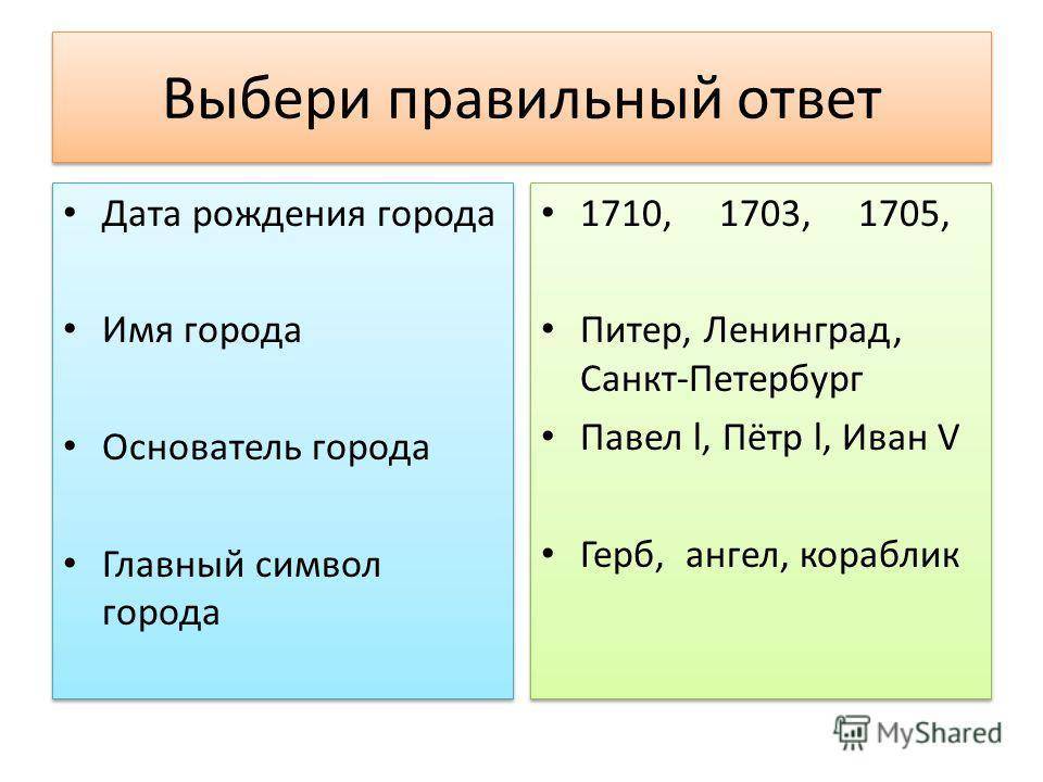 Выбери правильный ответ Дата рождения города Имя города Основатель города Главный символ города Дата рождения города Имя города Основатель города Главный символ города 1710, 1703, 1705, Питер, Ленинград, Санкт-Петербург Павел l, Пётр l, Иван V Герб, ангел, кораблик 1710, 1703, 1705, Питер, Ленинград, Санкт-Петербург Павел l, Пётр l, Иван V Герб, ангел, кораблик