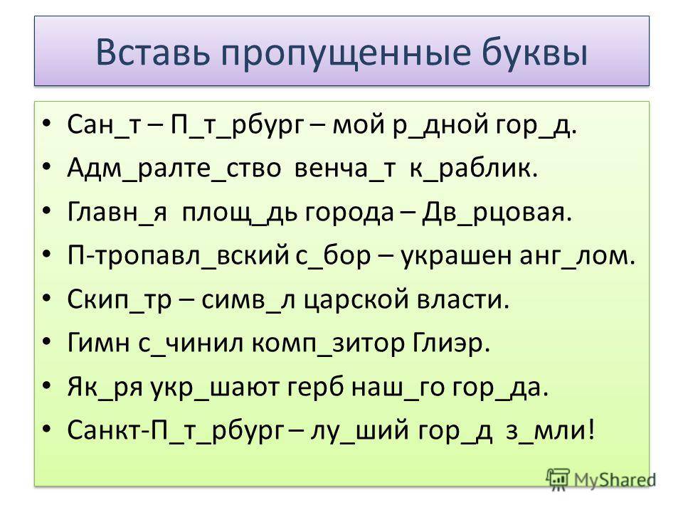 Вставь пропущенные буквы Сан_т – П_т_рбург – мой р_дной гор_д. Адм_ралте_ство венча_т к_раблик. Главн_я площ_дь города – Дв_рцовая. П-тропавл_вский с_бор – украшен анг_лом. Скип_тр – симв_л царской власти. Гимн с_чинил комп_зитор Глиэр. Як_ря укр_шают герб наш_го гор_да. Санкт-П_т_рбург – лу_ший гор_д з_мли! Сан_т – П_т_рбург – мой р_дной гор_д. Адм_ралте_ство венча_т к_раблик. Главн_я площ_дь города – Дв_рцовая. П-тропавл_вский с_бор – украшен анг_лом. Скип_тр – симв_л царской власти. Гимн с_чинил комп_зитор Глиэр. Як_ря укр_шают герб наш_го гор_да. Санкт-П_т_рбург – лу_ший гор_д з_мли!