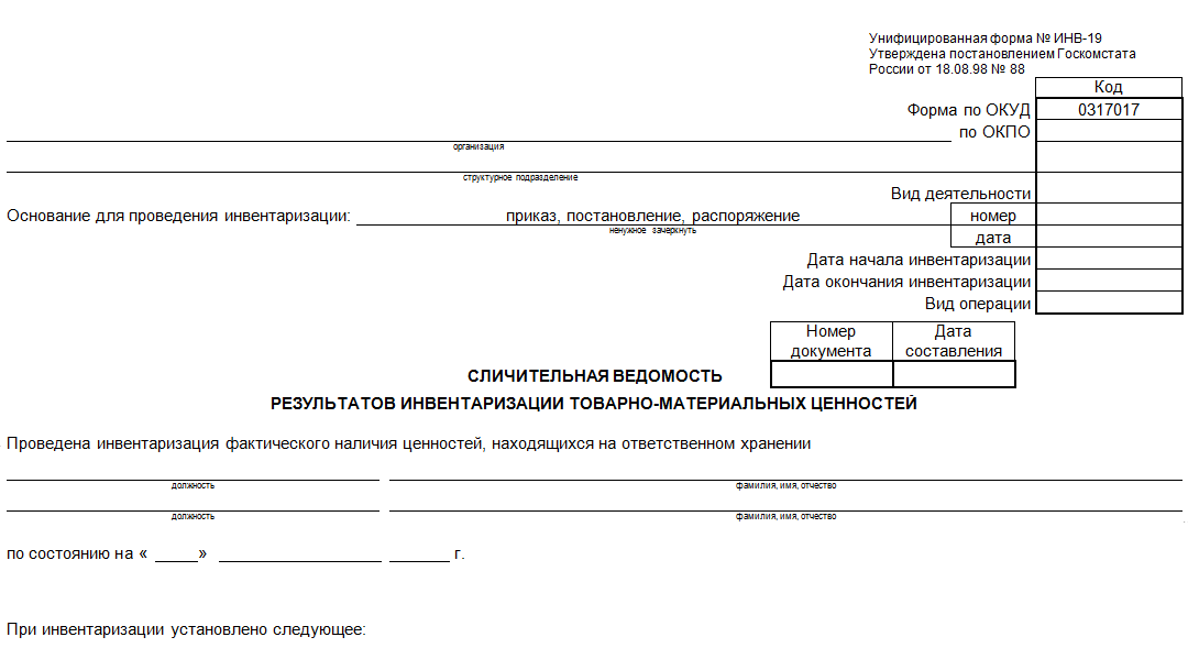 Все выявленные расхождения между ними заносятся в сличительную ведомость результатов инвентаризации основных средств ИНВ-18, утвержденную постановлением 88, или аналогичную ей форму, разработанную организацией.