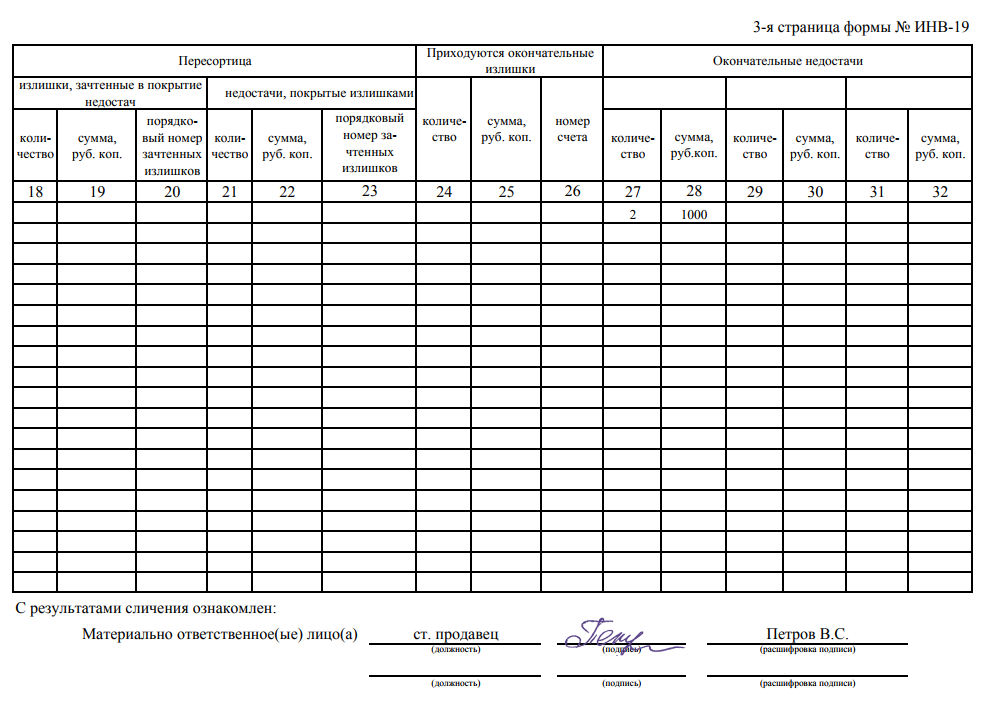 Оставшиеся графы заполняются информацией об имеющейся итоговой недостаче.