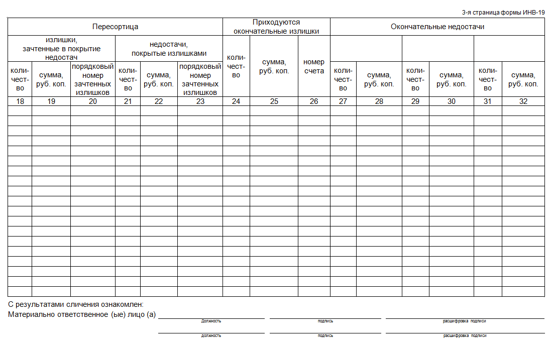- Основная часть сличительной ведомости представлена в виде таблицы, в которой фиксируются результаты инвентаризации. Необходимо указать только те группы товаров, по которым обнаружена недостача и/или избыток (в том числе в результате пересортицы). В форме ИНВ-19 содержатся 32 графы, в том числе: